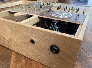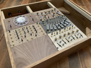 Given the amount of possibilities the modular approach was the only one that made sense for me. It kept my head from spinning. And since my 3U setup is mostly metal panels, and I have access to wood scraps, I thought I'd give that a go. The patch points are made with bolts. Golds are ins and blacks are outs. I like the grid-like uniform look of the Buchla 100 series and I thought if the panels were more wide than they are tall it would lend itself well to sequencers and the like, make it feel a bit more keyboardy for lack of a better term.