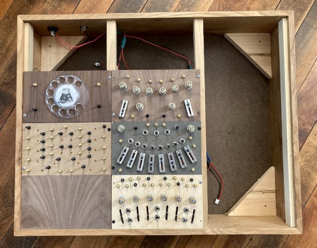 A while ago I posted a pic of this modular lunetta in progress, and here it is now. And also a while ago I built a bunch of stuff and put it in there. And then also a while ago I made a tape of very noisy playing with it. So I pulled it out, gave it a light dusting, and took a picture for you, dear reader.