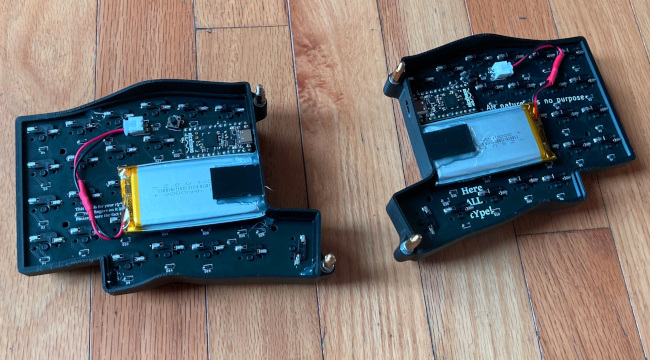 So where to start? I didn’t want to go crazy, nor did I want to go crazy, so 58 keys total seemed manageable (a full keyboard with the numpad and stuff is 104 keys), especially when you take into account layers which act like the shift key but completely change the layout. I watched this video and loved the approach–wireless, a hidden microcontroller and battery, and no need for LEDs.
