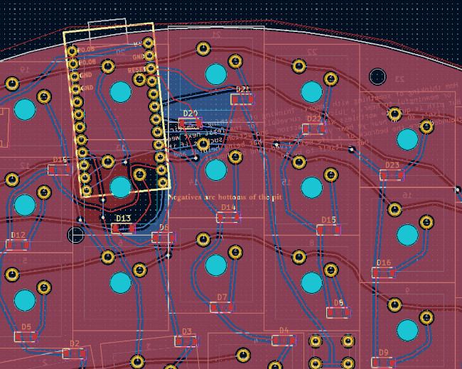 I quickly stumbled upon some software that a lot of people swear by called Ergogen. It was fun to use and helped me get my head around the layout and spacing of the keyboard. But probably the biggest drawback for me is that the end result of using this program is PCB footprints spaced out properly in KiCad. No schematic, no traces drawn. So I used Ergogen to get my layout into kicad then reverse engineered it to get the schematic (not very complicated) then laid out the PCB from there. But hey if Ergogen works for you, go for it! I understand that not everyone wants to learn KiCad either, and I’m sure there’s some functionality to it that I hadn’t tapped.